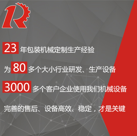 廣州市睿佳機械設備有限公司是國內專業從事自動化包裝機械產品,集研發、生產、銷售、服務于一體的制造公司,已通過ISO9001:2008質量體系認證,部分系列產品已通過歐盟CE認證。 經過多年的發展,公司專業生產:封尾機,灌裝機,旋蓋機,貼標機,包裝機,輸送機,噴碼機,灌裝生產線等機械設備。企業以開發生產包裝機械和訂做特殊包裝機械為主,所生產的包裝機械在同行和客戶中都得到一致的贊賞,以高技術和穩定的質量遠銷東南亞和歐美。在國內,也成為多家知名藥廠、食品廠、化妝品廠指定使用產品。 睿佳機械:“想客戶之所想,急客戶之所急”既是睿佳對廣大客戶的承諾也是睿佳的宗旨,睿佳將與時代同步、銳意進取,以更優質的服務回報廣大客戶對睿佳的信賴和支持。